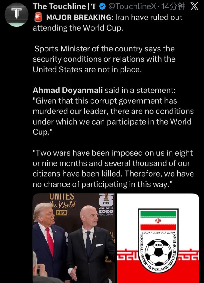 值得一提的是,国际足联主席因凡蒂诺也在同一天发文,表示自己已经与美国总统特朗普有过谈话,伊朗男足参加世界杯没有问题。理想很美好,现实很骨感,在如今如此敏感的政治环境下,伊朗男足确实很难去美国比赛。